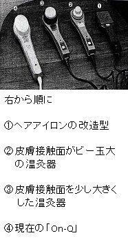平成3年、新田親弘が当時常務取締役を務めていた『三友電気(株)』に 構造的にも、機能的にも、更なる改良を求めた三井先生より 温灸器の開発依頼を頂きました。 試行錯誤を重ね 2年間かけ構造的には現在の「On-Q」と同程度の物を作り上げ 平成6年、平成7年には、通産省と厚生省の医療用具製造承認許可を得ました。 (当時の医療用具承認番号:平成6年06B-95:平成7年07B-0857) 三井先生はアイシー温灸器のもとで 温灸器による治療法の考案と販売を担当して頂き 三友電気が、温灸器の開発と製造を担当するという形で提携を結び お互いに協力をし合い、念願の温灸器を販売する事が出来ました。 この当時、アイシー温灸器より 『三井式温熱治療器』の名称で販売された物が 現在普及しております『On-Q』なのです。 ・・しかしその後間もなくし、この温灸器を巡り様々なトラブルが起こり 順調に進んでいた温灸器の販売は、一旦宙に浮いた状態になってしまいます。 |